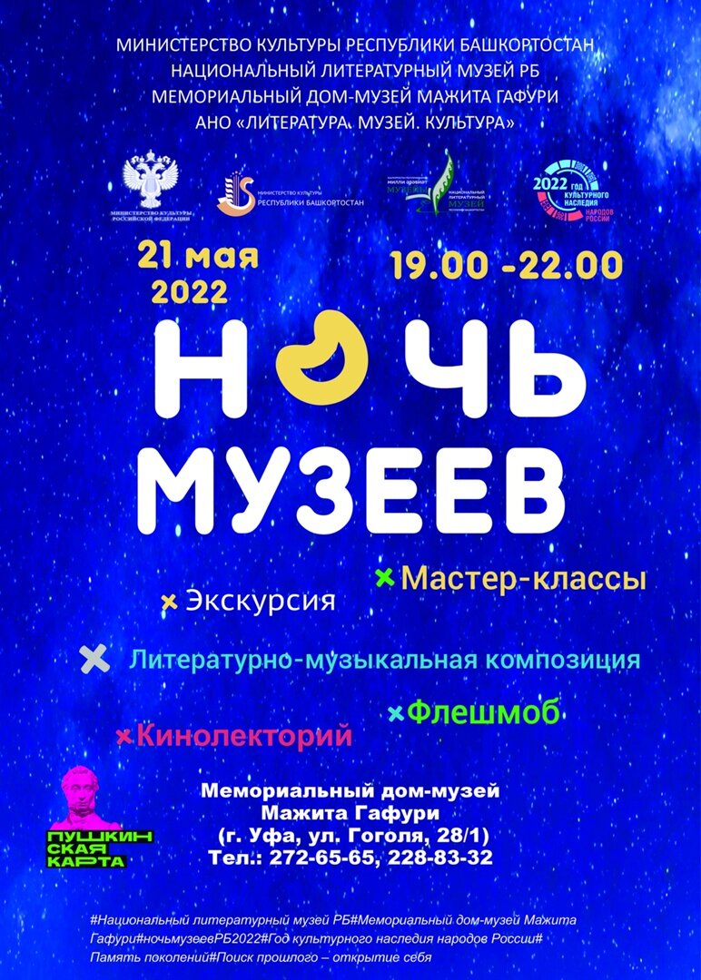 Приглашаем Вас 21 мая 2022 года на Всероссийскую акцию «Ночь музеев». В этот вечер запланированы к проведению такие мероприятия, как музыкально-литературная композиция «Пусть не забудет меня Родина!», выставка «Примите поздравления», мастер-классы «Изготовление стилизованных украшений, гвоздики-символа памяти», «Роспись по камню», открытие выставки «Книги бывают разные», выставка-продажа товаров декоративно-прикладного искусства, игры военных лет для детей и взрослых, конкурсы стихотворений, «Рисуем на асфальте», концерт студентов вокального отделения УГИИ им.З.Исмагилова, кинолекторий, флешмоб «Мы против нацизма». Также для посетителей музея будет предложено солдатское меню. Участники конкурсов будут награждены призами. Начало мероприятий в 19.00.