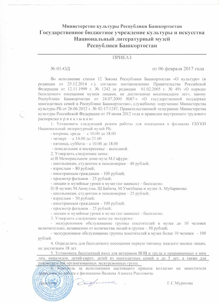 Приказ ГБУКИ НЛМ РБ № 01-ОД от 06 февраля 2017 года