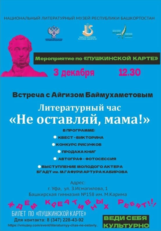 3 декабря 2021 года в 12.30 час. на базе Башкирской гимназии № 158 им.Мустая Карима Национальный литературный музей Республики Башкортостан проводит встречу с молодым писателем, автором книги «Не оставляй, мама!» Айгизом Баймухаметовым.